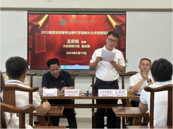6月19日下午,现代农业学院在振兴园茶文化非遗传承教室举行2022级“大北农”企业奖学金颁奖暨2023级学徒制开班仪式。大北农集团四川区副总裁王府民、总裁助理唐强、人力资源总监王兴平、宜宾人力经理易静,学院党委书记林世全出席。仪式由现代农业学院院长先元华主持。