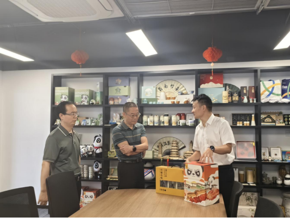 在文创产品中心,朱福军详细介绍了宜宾文旅协会“九个一”理念,同时向在场嘉宾介绍了蜀南文旅集团设计售卖的以宜宾酒、竹、哪吒文化为主题的文创产品。