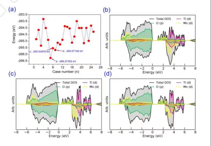 图片说明:(a)DFT 计算 25 种 Li-Mn-Ti-O 构型的总能量分布, (b)(c)(d)三种低能配置状态的总密度和部分密度。