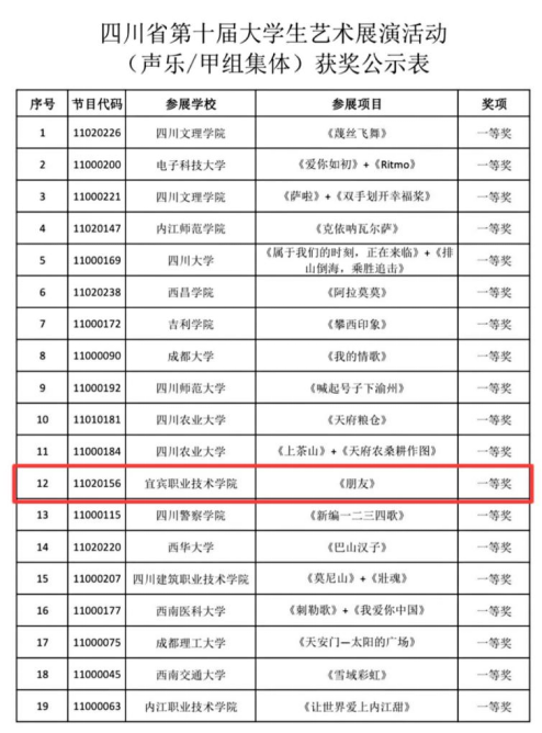 由四川省教育厅主办、成都师范学院承办、温江区人民政府协办的四川省第十届大学生艺术展演活动于8月22日至29日在成都师范学院举行,我院荣获1个一等奖、1个二等奖、5个三等奖。