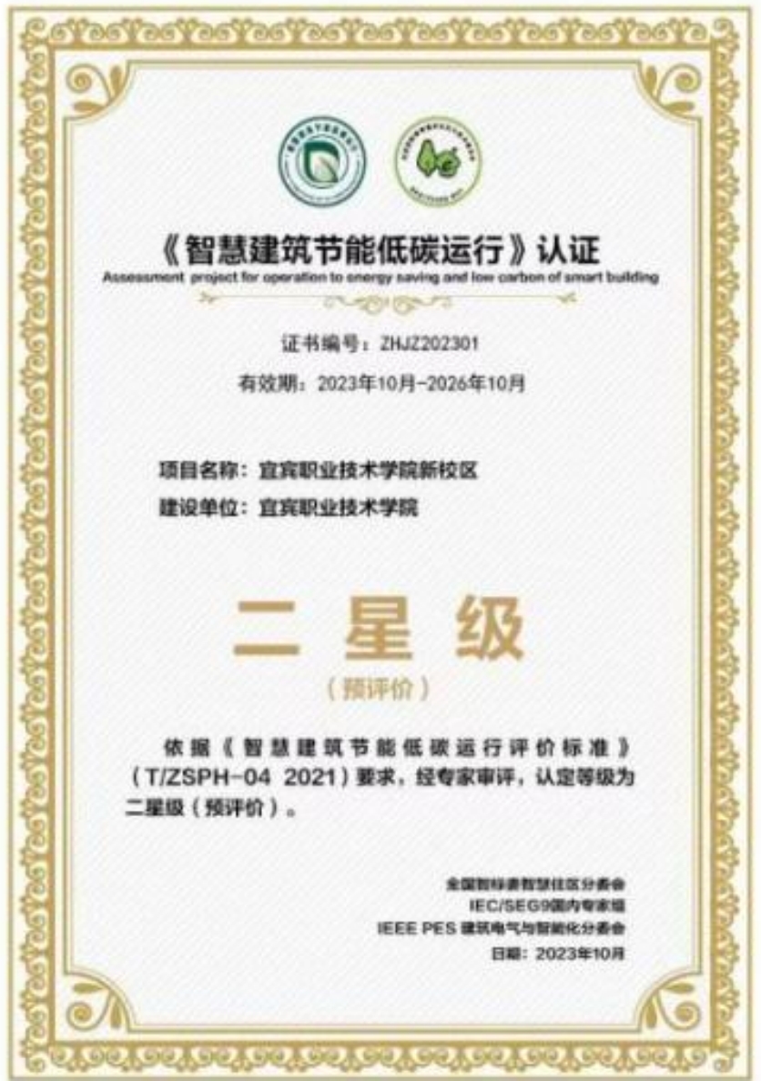 宜宾职业技术学院新校区建设将绿色低碳的理念贯穿校区规划和建设管理的全过程,智慧建筑节能低碳运行认证,是对我院在四川省率先打造绿色低碳校区的实践与探索的高度肯定,我院将持续提升学科创新能力,持续推动职业教育优化升级,汇聚加快推进职业教育可持续化低碳绿色发展。充分发挥高等学校的社会责任担当和引领示范作用,为建筑领域加速实现碳减排目标积极贡献力量,用智慧科技助力建筑业实现国家“双碳”目标。