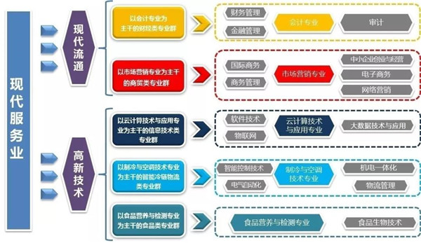 聚焦现代流通产业转型升级与高技术服务业快速成长,持续优化专业结构,按照“专业基础相通、技术领域相近、职业岗位相关、教学资源共享”的原则,对接国际标准,聚力打造专业群发展排头兵。学校打破原有的院部限制,打造了以会计、市场营销、云计算技术与应用、制冷与空调技术、食品营养与检测等专业为主干的5个优势专业群,使以“以财经商贸类专业为主体、以信息工程技术类专业和人文艺术类专业为两翼”的“一体两翼”专业布局进一步优化。